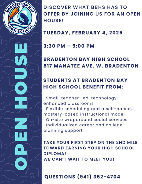 Date: Friday, January 24, 2025 Time: 3:30 PM – 5:00 PM Location: Bradenton Bay High School 817 Manatee Ave. W, Bradenton, FL 34205